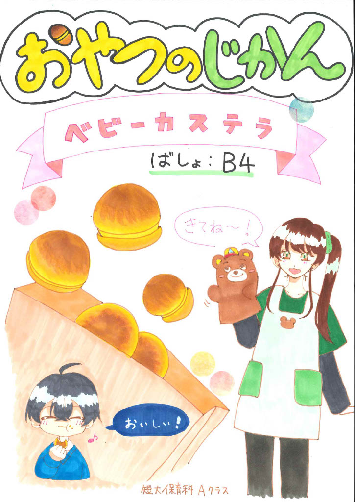 私たち、短大保育科Aクラスでは、「ベビーカステラ」を販売します。子どもから大人まで、幅広い世代の方が楽しめる味です。大人の方は昔懐かしい味を、お子さんは、楽しい思い出の味をぜひ。片手で簡単に食べられるので、お友達やご家族とどうぞ。保育科らしく、笑顔と元気いっぱいでお待ちしています!