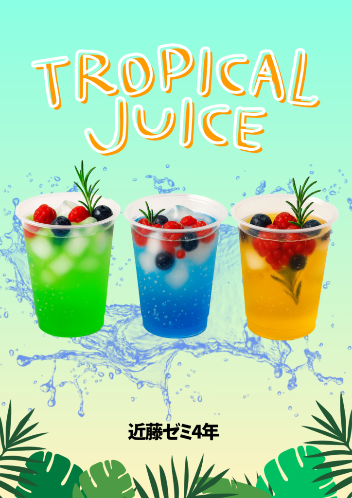 近藤ゼミ4年は、カラフルでリゾート感あふれるトロピカルジュースを販売します!甘いシロップと爽やかな炭酸で気分爽快!暑さも疲れも吹き飛ばす一杯で、心と体をリフレッシュ!楽しい時間を作るドリンクを、ぜひ味わってください!皆さまのお越しをお待ちしています!