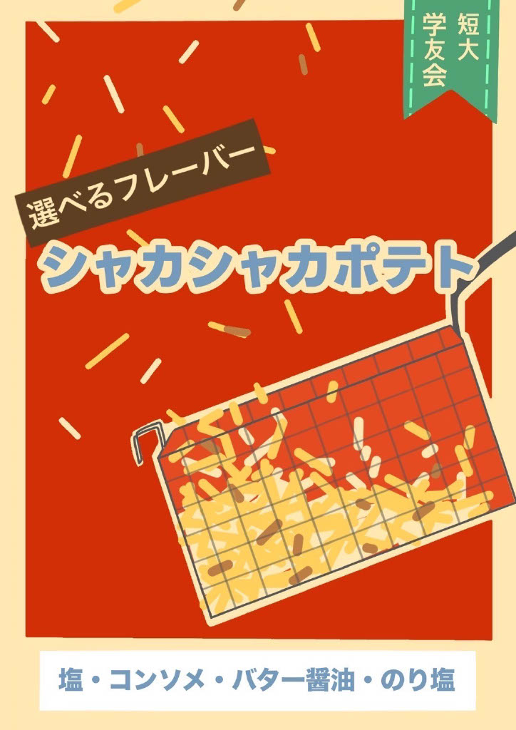 短期大学部学友会が送る、シャカシャカポテトです!コンソメ味や、バター醤油味など様々な味を取り揃えております。各種商品を潤沢に作ってお待ちしておりますので、心薙祭、当日ぜひ食べに来てください。たくさんの方が訪れてくれることを楽しみにしています!
